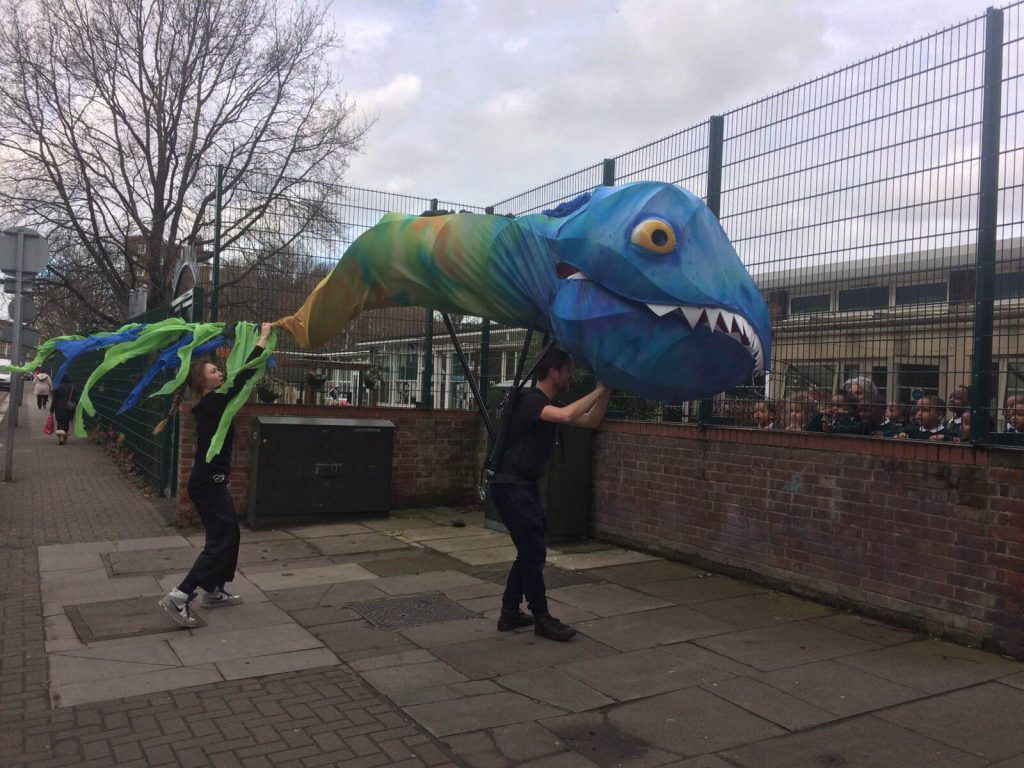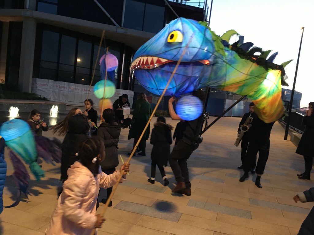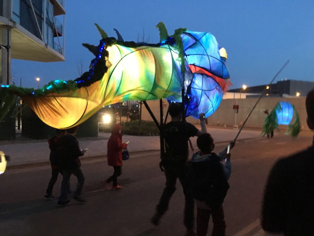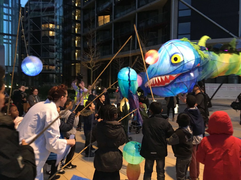 Young people designed and created their very own river monster lanterns, which they paraded alongside a giant toothy tadpole puppet called Arthur created by Puppets with GUTS.